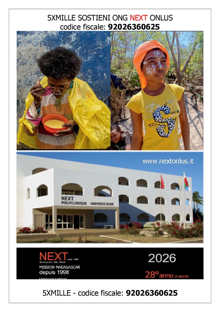 La NEXT onlus nasce nel 1998 per volontà di un ricercatore scientifico, Luigi Bellini il quale, a seguito di un viaggio in Madagascar, profondamente toccato dalle terribili condizioni di vita della stragrande maggioranza (80%) della popolazione, decise di impegnarsi concretamente in un’azione umanitaria dedicandovi ogni sua energia e risorsa.